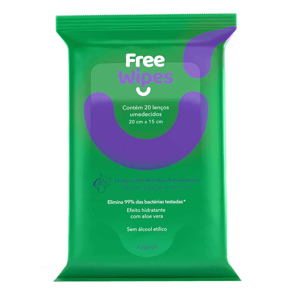 Free Wipes são lenços umedecidos antissépticos que eliminam 99% das bactérias, ideal para higienização das mãos antes e depois de entrar em contato com maçanetas, tampa do vaso sanitário, mouse, teclado, celular, etc. Proporciona limpeza profunda, com efeito hidratante e fragrância de Aloe Vera.